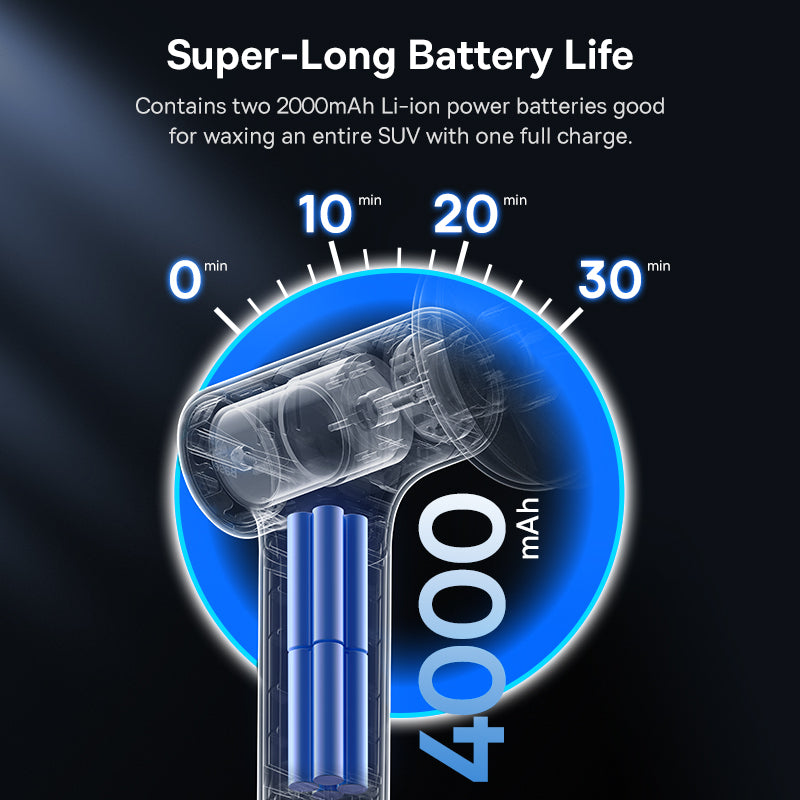 The Baseus Car Polishing Machine is a cordless mini electric polisher built for efficiency and convenience. Powered by two 2000mAh Li-ion batteries, it can wax an entire SUV on a single charge. This machine features a large 120mm diameter backing plate for a larger contact area, ensuring swift and thorough waxing. Beyond just waxing, it's designed to efficiently repair shallow scratches, giving your car a fresh look and protection from corrosion caused by acid rain. Additionally, it quickly polishes to remove swirls, casting an invisible protective layer that refracts sunlight and UV rays to minimize damage. With adjustable speed settings, it's suitable for both car and home wireless polish waxing needs, always leaving your possessions looking their best.